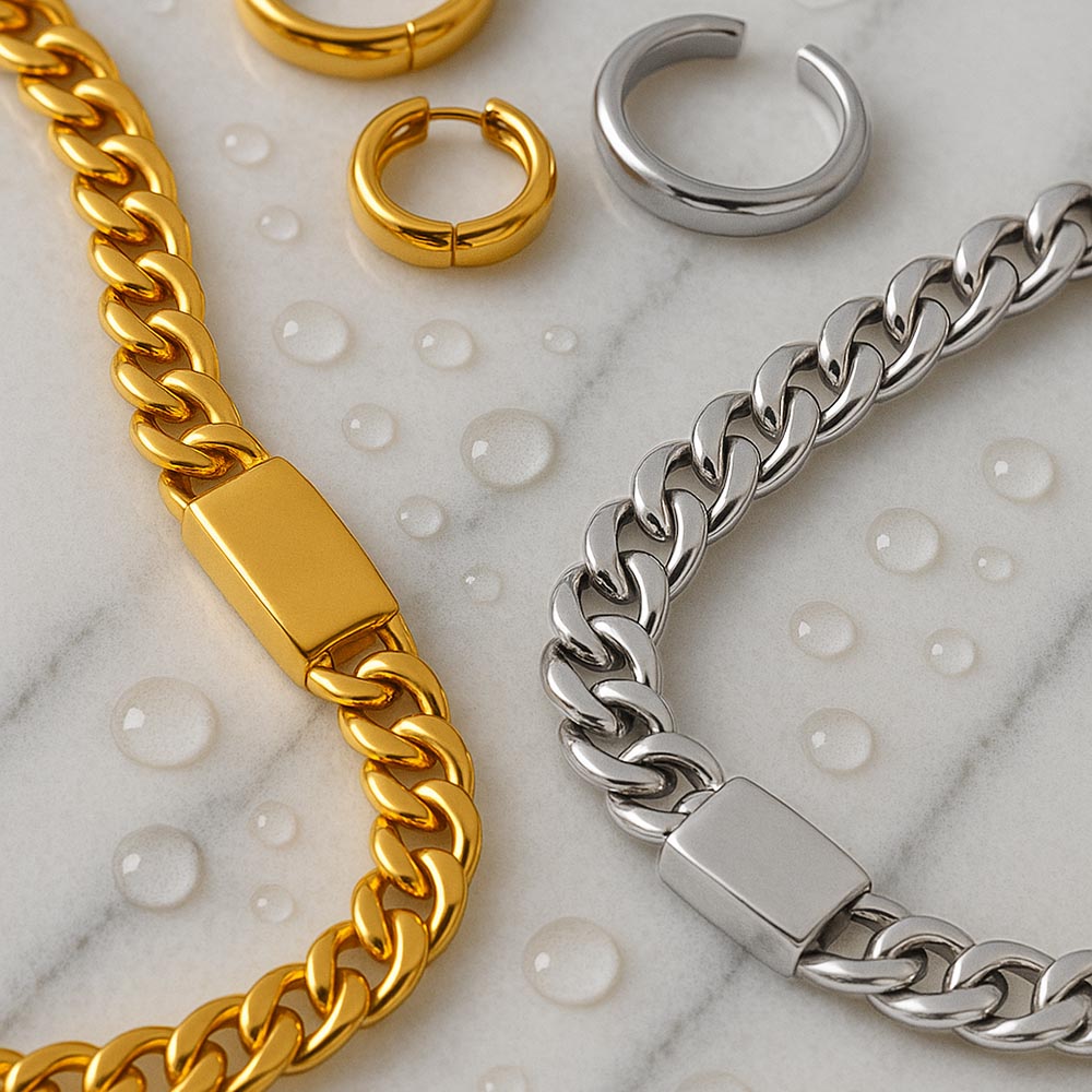 We craft our jewelry using premium quality stainless steel, known for being nickel-free, hypoallergenic, and tarnish-resistant — perfect for sensitive skin and everyday wear.